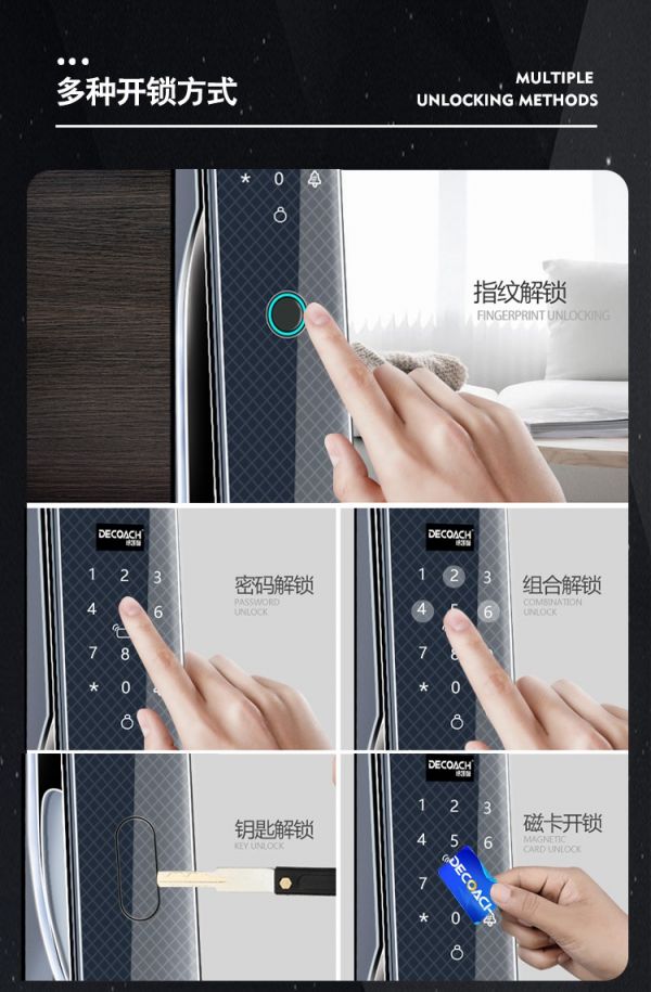 德鎧曼智能鎖M1-2(幻影2號)為用戶提供了指紋、密碼、組合開鎖、遠程開鎖、刷卡開鎖、鑰匙開鎖等六大解鎖方式,方便快捷。接下來讓我們來看一下其中幾種的實際解鎖效果。