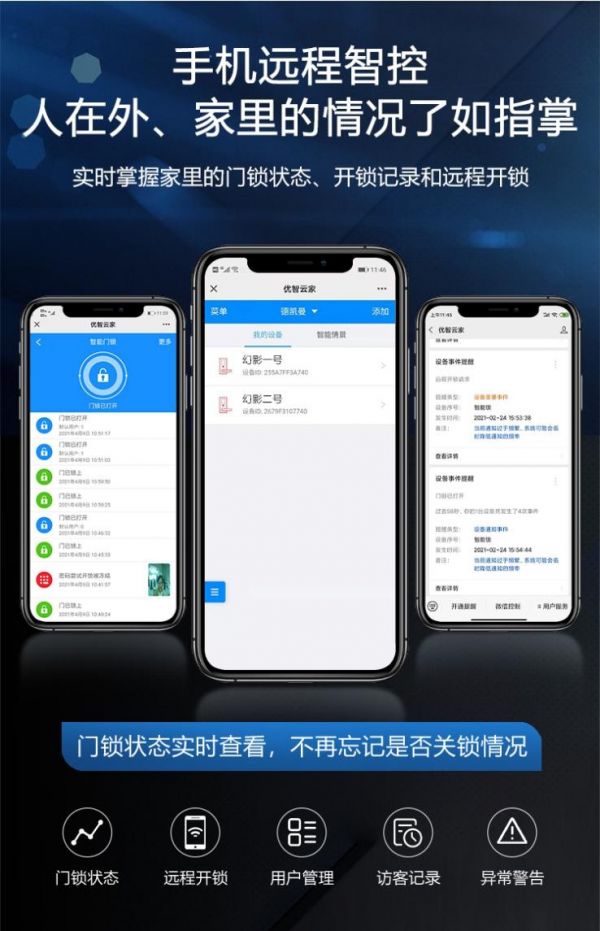 同時,用戶還可以通過貓眼和手機實現遠程智控,即使不在家,也可對家里的情況了如指掌,實時掌握家里的門鎖狀態、開鎖記錄、遠程開鎖、用戶管理、訪客記錄、異常警告等,安全放心。