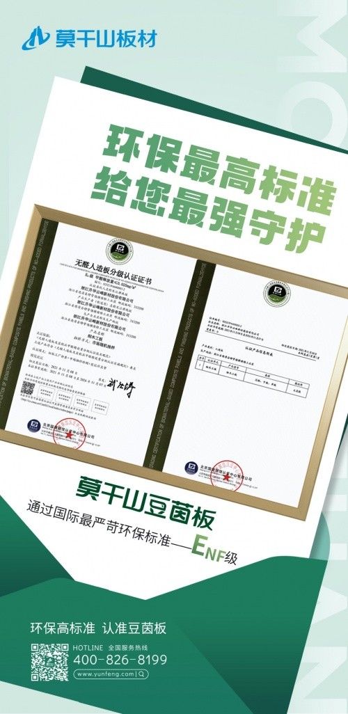 2021年11月,通過初始工廠檢查、市場隨機抽樣檢測和獲證后監督的模式,依據《無醛人造板及其制品甲醛釋放量分級認證技術規范》,國建聯信對豆茵板的芯板、中板和單板基材以及大豆蛋白膠粘劑進行了甲醛釋放量的全面檢測,檢測結果再次表明豆茵板完全達到了甲醛釋放量≤0.025mg/m3的ENF級環保標準要求,并頒發了無醛人造板分級認證證書,準許莫干山豆茵板使用ENF分級認證標志。莫干山板材也成為行業首批獲得該證書的企業。