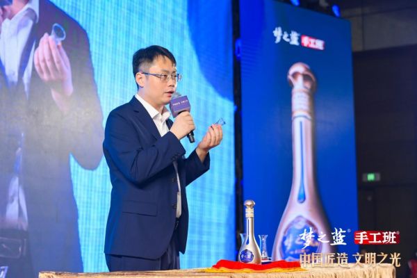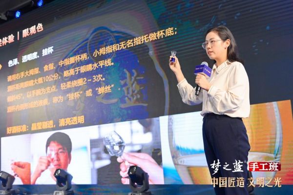 洋河大師工作室,全國品酒師大賽冠軍田銳花上臺夢之藍·手工班做演講推介。七個字總結它的特點:尊貴、稀缺、更好喝。尊貴取決于三個因素。第一個因素是“老窖”,手工班全部出自夢之藍中央酒區的百年明清老窖。俗話說:千年老窖萬年糟,酒好全憑窖池老。第二個因素是老酒,手工班選用的都是20年以上的老酒作為基酒。酒體經過20年的自然老熟,更平衡、更綿柔、更飽滿。第三個因素是“老匠人”。手工班在傳統三低工藝的基礎上,采用的是非遺手釀技藝。每一滴酒體都需要經歷137道手工工藝。明清老窖產的原酒經過層層篩選、優中取優只有15%才能符合手工班的品質要求。20年以上的特級老酒,20年的修煉雕琢,20年以上老匠人的精心打造,使得手工班喝起來更加醇厚、細膩、綿長。