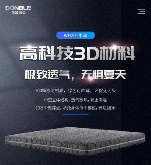 夏天睡覺易出汗,躺在濕噠噠的床上,渾身不舒服。有沒有辦法可以避免床墊被汗水浸濕呢?東寶床墊“牛津”采用3D透氣網面,水分不容易存留,能夠快速干燥。床墊內部使用3D材料填充,3D材料同樣具有透氣速干的特點,快速排出床墊內部的濕氣,為我們保持一個干爽舒適的睡眠環境。