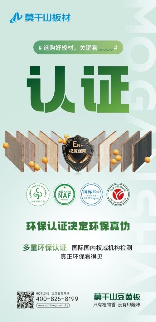 2021年11月,通過初始工廠檢查、市場隨機抽樣檢測和獲證后監督的模式,依據《無醛人造板及其制品甲醛釋放量分級認證技術規范》,國建聯信對豆茵板的芯板、中板和單板基材以及大豆蛋白膠粘劑進行了甲醛釋放量的全面檢測,檢測結果表明豆茵板達到了甲醛釋放量≤0.025mg/m3的ENF級環保標準要求,并頒發了無醛人造板分級認證證書,準許豆茵板使用ENF分級認證標志。莫干山板材也成為行業首批獲得該證書的企業。