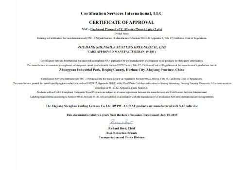 2019年,豆茵板實木基材獲得了由美國加州空氣資源委員會頒發的美國CARB-NAF無醛豁免認證。該認證是復合木制品甲醛釋放量最嚴格認證之一,證明了豆茵板從問世之初就已提前達成了ENF級新國標的環保品質要求。