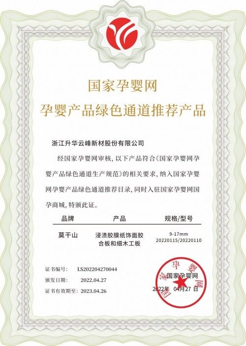 今年4月,莫干山豆茵板因符合《國家孕嬰網孕嬰產品綠色通道生產規范》和國家孕嬰網《托育與孕嬰居所環境安全防控規范》(Q/GJYY111.1-2020)的標準要求,被正式納入國家孕嬰產品綠色通道推薦目錄,同時獲得了“國家孕嬰網入網推薦證書”。
