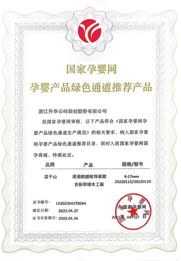 2020年,莫干山板材獲得中國環境標志產品認證和“兒童安全級產品”認證。2021年11月,莫干山板材膠合板、細木工板、飾面人造板等產品以市場隨機抽樣方式獲得了由國建聯信認證中心(GJC)認定產品符合GB/T 39600—2021《人造板及其制品甲醛釋放量分級》標準而頒發的無醛人造板分級認證證書,系列產品的甲醛釋放量≤0.025mg/m3,評為ENF級,莫干山板材也成為行業首家獲得該證書的企業。2022年4月,莫干山浸漬膠膜紙飾面膠合板和細木工板符合《國家孕嬰網孕嬰產品綠色通道生產規范》和國家孕嬰網《托育與孕嬰居所環境安全防控規范》(Q/GJYY111.1-2020)的標準要求,被正式納入國家孕嬰產品綠色通道推薦目錄,同時入駐國家孕嬰網國孕商城,獲得“國家孕嬰網入網推薦證書”。