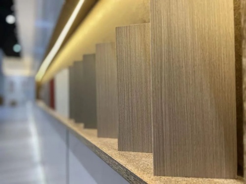 其基板是采用全桉木多層板為芯材,上下表層鋪裝進口松木細料刨花,經熱壓一體化成型,表面平整度高,是一種可飾面的新型結構板材。光滑細膩的表面,有效降低了壓貼飾面后碳化、鼓泡、波浪紋等問題出現的可能,顯著提升飾面平整度。展會上,千年舟合平板飾面系列獨特的性能賣點,成為各大客商爭相詢問的“寵兒”。