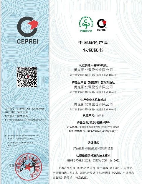 作為一家28年來專注于空調賽道的家電企業,奧克斯空調堅持以高質量、可持續發展為主要目標,以綠色低碳為主要行動路徑,致力于持續推進行業創新升級、不斷滿足消費需求、帶動上下游企業踐行綠色發展,與行業共同進步。此次它成為首批“中國綠色產品認證”家電企業暨空調企業之一,表明其產品在設計、生產、使用等全生命周期中均符合綠色發展理念,是對其綠色產品成長發展的充分肯定。