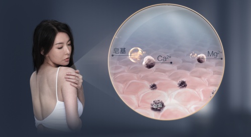 我國大部分地區水質為硬水,其中含有大量鈣、鎂離子,它們會與洗面奶、洗發水等清潔用品中的皂基反應,形成粘附力強的皂垢,阻塞在毛孔及皮膚角質層間隙中,無法深層清潔,進而破壞天然屏障皮脂膜,導致肌膚鎖水不足,皮膚干燥緊繃、敏感泛紅等問題隨之而來。甚至殘留在發絲上的皂垢,還會令毛鱗片難以閉合,因此洗完頭后,會出現發絲干澀毛躁的問題。
