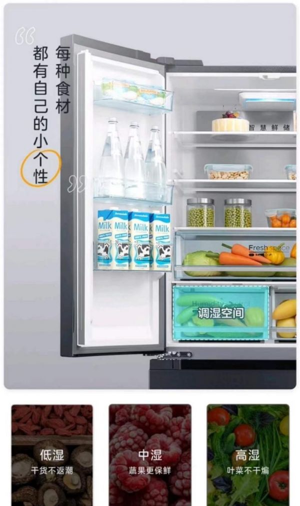 美的凈味冰箱可自由分儲的大空間,徹底解決了食材混雜存放的問題,果蔬室、冷藏室、調濕、變溫空間、冷凍室等,不同食材,不同的儲放空間。如調濕空間,可實現高濕、中濕、低濕三檔,木耳、枸杞等放低濕,不返潮;果蔬放中濕更保鮮。