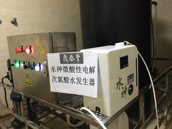 鼎泰豐中央廚房選用了水神HD-240L次氯酸水發生器,安裝在水池邊,配合電解液使用,可以源源不斷地即時制取殺菌率99.999%的水神消毒液使用。對,沒錯,是即時制取。如果說,在內蒙古打開水龍頭就是牛奶有點夸張,那打開水龍頭就是消毒液,這一點早已在鼎泰豐成功實現。