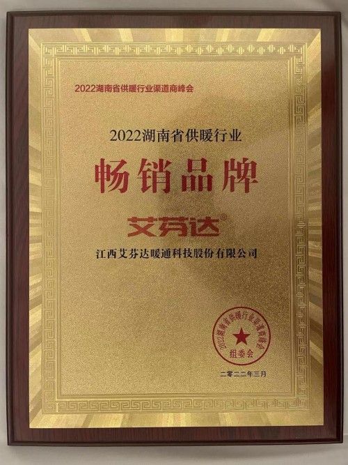 7月8日,在中國燃?xì)夤釋I(yè)委員會、中國建筑金屬結(jié)構(gòu)協(xié)會輻射供暖供冷委員會、中國建筑金屬結(jié)構(gòu)協(xié)會采暖散熱器委員會主辦的“2022湖南省供暖行業(yè)渠道商峰會”上,艾芬達(dá)榮獲“2022湖南省供暖行業(yè)暢銷品牌”榮譽(yù)。