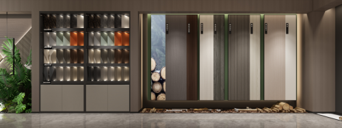 形象亮點——形象墻采用千年舟高雅灰板材作底,在燈光的映襯下整體呈現典雅溫和的質感,呼應品牌LOGO的簡約大氣。