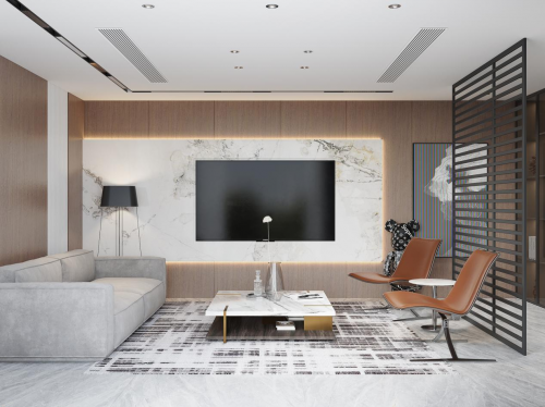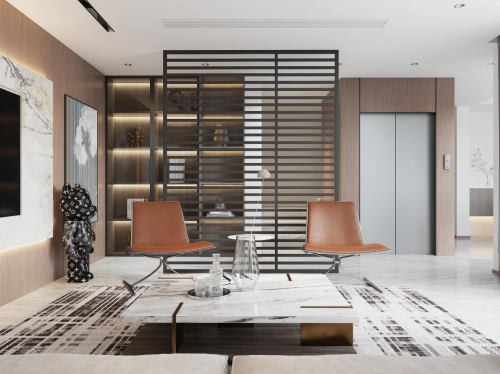 客廳空間——結合自帶的庭院,一樓客廳大面積的白色與棕色系墻板結合,彰顯空間更為通透利落,同色系的墻板融合獨立電梯,弱化突兀感,更進一步提升客廳的整體風格調性。極簡的軟裝適配,以金屬為細節點綴,閑適中的精致,現代風情盡顯。