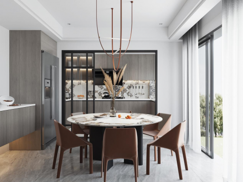 餐廳空間——灰色系的柜面與暖咖色的餐椅成為了視覺的核心色彩,流暢的金屬線條與木質紋理共同營造出立體感,帶來不動聲色的精致,餐廳空間的細膩美感也隨之蔓延開來;冷暖材質的對比,相互襯托,盤活了整個空間的靈韻。