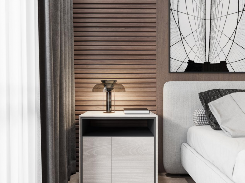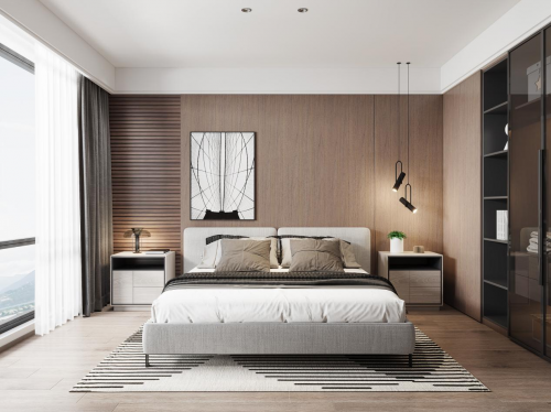 次臥——大面積的咖色墻板應用,帶有天然木紋的通直視覺,有效拉升了整體空間格局與層高,讓次臥在視覺上得以空間擴充,簡單的極簡吊燈與幾何元素床頭柜與腳蹬,帶來極簡空間的獨特精致感。