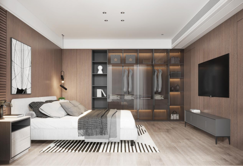 主臥——作為戶主的私密性空間,主臥的設計更多的結合了戶主的個人審美志趣,并打造出個性化風格,采用玻璃與格柵元素,碰撞統一咖色空間下的多元化材質展現,讓視覺沉浸入豐富、輕簡的生活場景中。材質與色彩反差的對比,帶來一場視覺盛宴,個性化的色彩,讓空間層次逐步遞進、升溫。