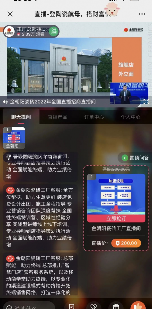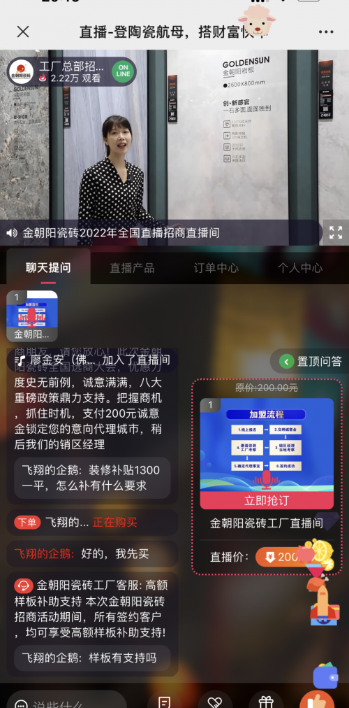 本次直播最引人關注的環節,由金朝陽品牌副總經理鄭凱給在直播間的意向客戶帶來了重磅的招商政策以及建店幫扶支持,招商期間支付200元誠意金搶六大招商特權以及優先鎖定空白城市席位的直播間專屬福利,全方位扶持經銷商,給意向經銷商注入強大的信心和動力。