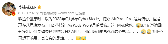 早先李楠的多條微博,也暗示 CYBERBLADE 在室外使用的延遲體驗,很可能無法與今年九月即將發布的下一代 AirPods Pro 競爭,甚至 CYBERBLADE 這款產品本身一度有因此取消的風險。