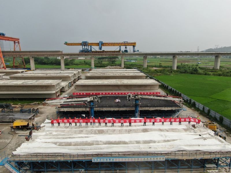南玉鐵路是由廣西交投集團投資建設的廣西第一條設計時速350公里的高速鐵路,是連通粵港澳大灣區及北部灣經濟區的重要通道,也是自治區政府關注的重點工程。鐵路正線全長193公里,經南寧、貴港、玉林三市,是廣西“一環五縱橫”干線鐵路網重要組成部分。南玉鐵路全線共設置箱梁預制場7座,預制架設箱梁3556榀。南玉鐵路玉州制梁場承擔著南玉鐵路玉林市境內303孔箱梁預制和架設任務,梁場于2020年10月開工建設,2021年3月10日預制第一榀箱梁,同年7月8日實現第一孔箱梁架設。