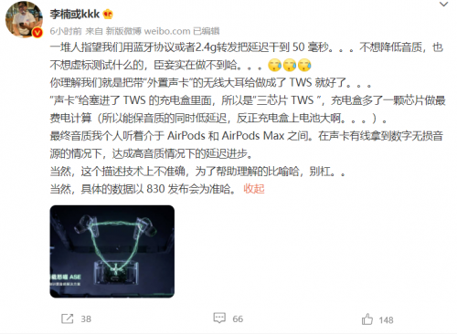 對于 CYBERBLADE 中加入的第三顆芯片,怒喵科技創始人李楠在 18 日當天就已經忍不住發微博透露其作用:通過在充電盒中增加另外一枚芯片,來協助兩個耳機完成消耗大量電力的計算音頻工作,同時借此實現音質與低延遲之間的平衡。
