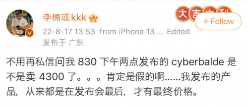 目前關于 CYBERBLADE 的價格我們還無從得知,對于先前爆料的 CYBERBLADE 定價 4300 元,李楠對此進行了辟謠,但沒有明確回應,結合此前怒喵科技多款產品的定價,此次 CYBERBLADE 最終仍然可能與其他怒喵產品一樣,有一個高昂的定價。