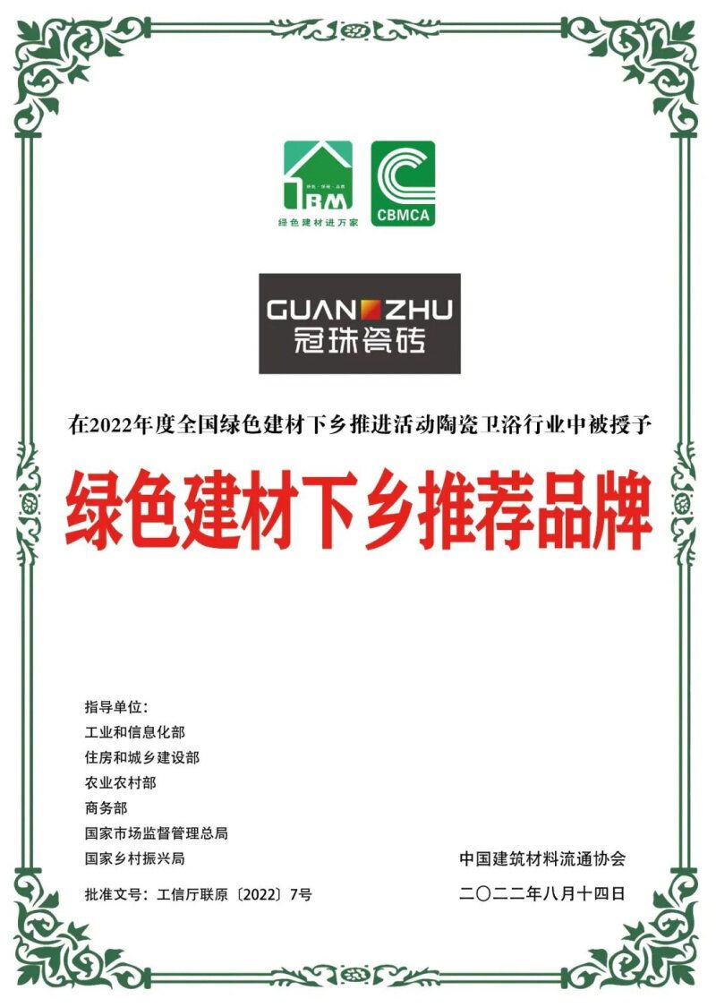 冠珠瓷磚與國家“綠色低碳”以及“鄉村振興”的發展大局同頻共振,作為綠色低碳的代表品牌,被授予“中國綠色產品認證”證書、入選CCTV央視網甄選中國優勢品牌并聯合CCTV央視網助推綠色家居產業鏈高質量發展、入選“綠色建材下鄉陶瓷衛浴推薦品牌及服務商”指導目錄后,這一次更是實力上榜“綠色建材下鄉推薦品牌”!