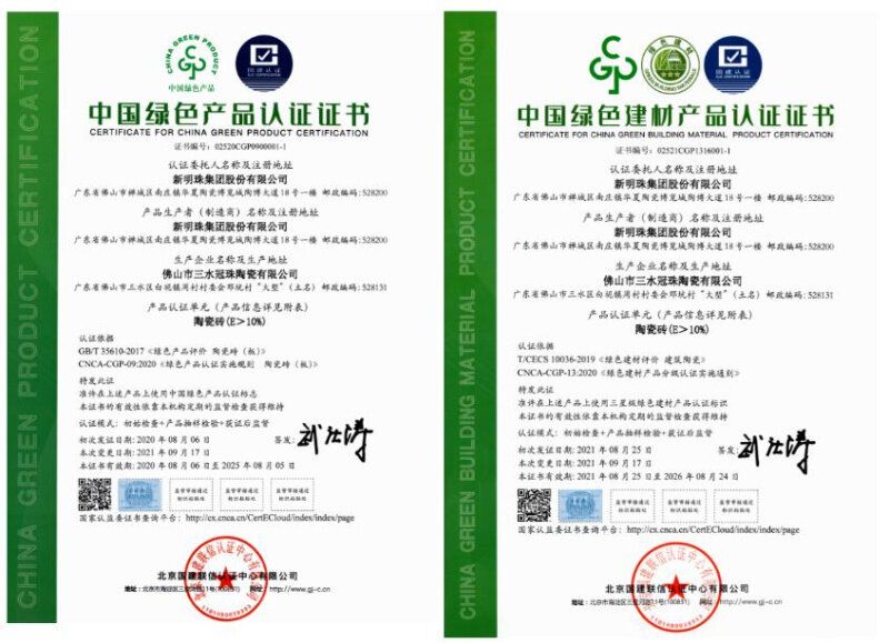 立足新型鄉村的建設需求,冠珠瓷磚致力打造石墨烯智控發熱巖板、抗菌巖板、護墻巖板、防滑磚、景觀磚等綠色建材產品,為新型鄉村建設提供多元的選擇,被授予“中國綠色產品認證”證書,證明其產品在全生命周期中均符合綠色發展理念,是國家重點推薦使用的綠色健康產品。