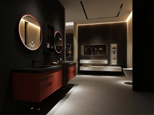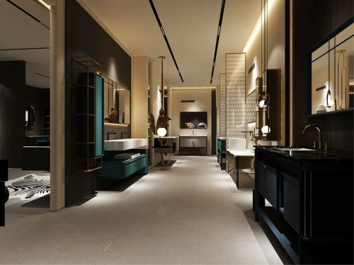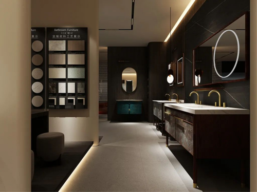 新展廳采用「黑灰」從展廳整體外觀到形象墻、洽談區(qū),再到浴室柜展示區(qū)、產(chǎn)品體驗(yàn)區(qū),采用不同的組合式設(shè)計(jì)和軟裝搭配,以新穎設(shè)計(jì)充分展現(xiàn)出浴室柜與家居相融合的極簡(jiǎn)輕奢風(fēng)格的時(shí)尚感與高級(jí)感,將唯可衛(wèi)浴惟精惟一、以木為本的理念、主打產(chǎn)品和企業(yè)文化融入空間,于細(xì)節(jié)中展現(xiàn)輕奢魅力,演繹精致舒適生活。