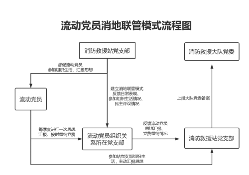 一是以聯管模式為“把控點”,促流動黨員“收心”。建立流動黨員消防地聯管模式,基層隊站黨支部主動與流動黨員組織關系所在黨支部建立聯系,隊站黨支部通報流動黨員日常表現、參加組織生活和民主評議情況,流動黨員組織關系所在黨支部反饋流動黨員思想匯報和交納黨費情況,流動黨員不僅要參加隊站黨支部組織的活動,還要定期向組織關系所在黨支部進行思想匯報,每月交納黨費。通過消地聯管模式,進一步強化了流動黨員組織觀念和組織意識。