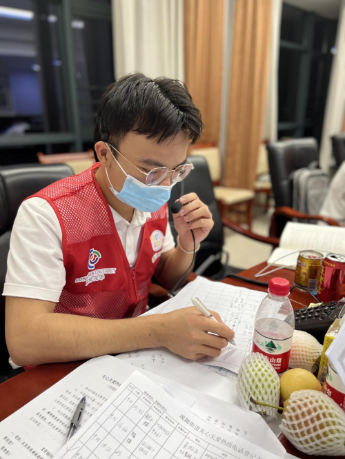 晚上11點到早上7點,他們守在電話前,當上了特殊“客服”,接聽社區居民的求助電話,在他們的聲音里,有家里物資不夠的反映,有身體不舒服的求助信息,還有許多帶來不便的狀況需要解決。志愿者們耐心安撫他們,并解決他們的問題。