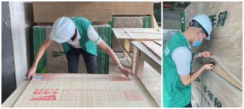 現(xiàn)場千年舟抽檢服務(wù)人員同項(xiàng)目負(fù)責(zé)人一起在現(xiàn)場對倉庫和施工場地的千年舟板材產(chǎn)品進(jìn)行了全方位檢測,包括板材含水率、尺寸、厚度等;同時(shí)針對施工現(xiàn)場和倉庫儲(chǔ)存進(jìn)行了常規(guī)的注意事項(xiàng)科普,以及消防注意事項(xiàng)和施工安全等進(jìn)行了詳細(xì)的科普;現(xiàn)場負(fù)責(zé)人對千年舟的服務(wù)和質(zhì)量的把控的態(tài)度包括對客戶的全方位負(fù)責(zé)的服務(wù)行為給予高度評價(jià)。