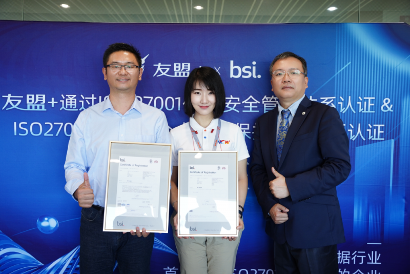 9月23日,再認證頒證儀式在京舉辦。BSI中國區標準應用方案副總裁張樂先生代表BSI授證,并對友盟+順利通過該兩項權威的管理體系國際認證表示熱烈祝賀。友盟+法務&合規負責人姚棟、法務合規專家賈紫薇代表友盟+接受證書。