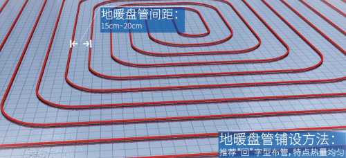 鋪設(shè)地暖需要先鋪設(shè)保溫層、反射膜及地暖盤(pán)管并安裝卡釘,盤(pán)管最好按照“回”字型布管,保持15-20cm間距,這樣有利于熱量均勻分布。安裝卡釘時(shí),要注意彎曲管段和直管段固定間距點(diǎn)保持間距不同。