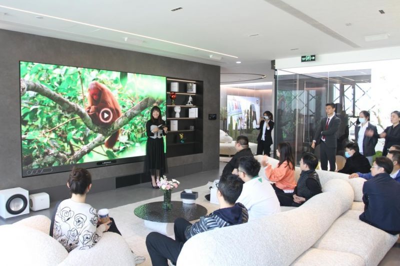 走進店內,獨樹一幟的設計風格,極具空間感的區域規劃搭配黑科技產品——2臺138吋雷曼Micro LED超高清家庭巨幕坐鎮C位,致力打造豪華客廳、私人家庭影院場景,為高端用戶帶來全新沉浸式體驗的同時更帶來了品質生活的解答方法。