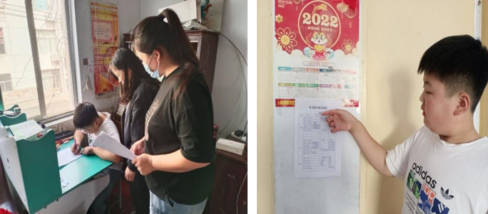 在五1班徐同學家中,孟老師和徐同學及徐媽媽一起分析了他每日時間安排情況和近期目標,徐同學自己制定出了早讀、閱讀、運動和周末家務勞動的規劃,讓家長也學到了理解孩子、幫助孩子成長的知識。
