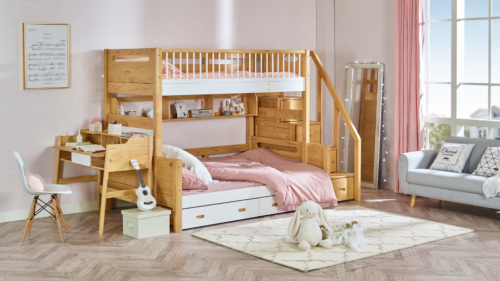 .上下床就是屬于一種百變造型,各種各樣,還可滿足不同戶型需求,就算是一個孩子也能滿足他們睡上床夢,不僅滿足睡上床夢,還給孩子們騰出了儲物空間和娛樂空間,當然學習空間也不能少,相當于一床解決孩子需要的一切!