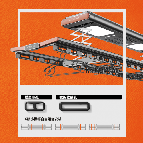 例如極具美學視覺效果的創新晾孔,1個蝶型晾孔其實相當于2個常規晾孔。其實千萬不要小看這個細節的革新,不但讓晾曬衣物翻倍,還起到美觀顏值的作用。并且4個衣架收納孔、6根自由橫桿、4排母嬰夾,這些元素的增加,使得晾衣機更加實用,是對產品的更進一步的深究和鉆研。