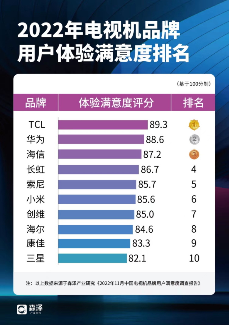 此外,從最近權威調研機構森澤產業研究公布的「2022中國電視品牌用戶滿意度調查」報告來看,TCL品牌的用戶凈推薦值最高,為50.7%,即品牌用戶忠誠度最高;同時用戶對TCL品牌的整體滿意度評價最高,為89.3分,且TCL品牌在各項體驗方面均表現突出。換句話說,憑借優秀的產品終端打磨,TCL電視能夠滿足絕大部分消費者的需求,獲得了更多消費者認可,在用戶留存的同時能夠獲得吸納更多新用戶。