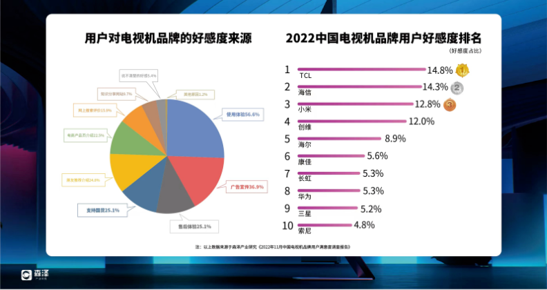 排名前五的品牌依次為:TCL、海信、小米、創(chuàng)維、海爾,其中14.8%的用戶表示對TCL好感度最高,在用戶好感度排名中位列第一,之后依次是海信14.3%、小米12.8%、創(chuàng)維12.0%、海爾8.9%等等。前三大品牌的好感度來源主要集中在自身對該品牌產(chǎn)品的使用體驗、品牌的廣告宣傳,以及良好的購買售后體驗等。