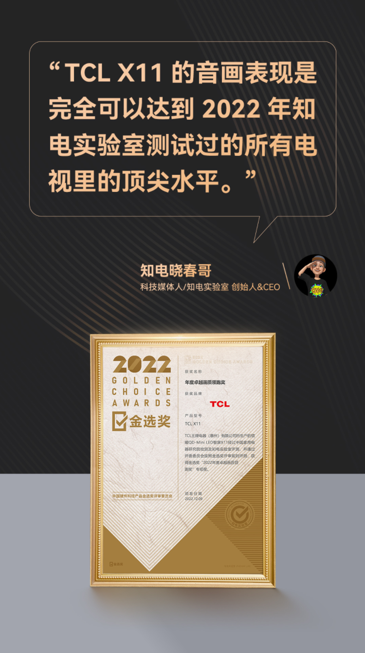 以剛剛榮獲2022年度金選獎「年度卓越畫質(zhì)領(lǐng)跑獎」的TCL X11為例,其搭載了自研的QD-Mini LED屏幕顯示技術(shù),選用了旗下面板制造商華星光電的A++蝶翼超顯屏,同時在此基礎(chǔ)上融入了2304分區(qū)量子點控光、2000nits峰值亮度、1000萬:1的超感知對比度、高達157%的色域值和德國萊茵TUV低藍(lán)光認(rèn)證,并輔之以5聲道7單元的2.1.2 Hi-Fi音響,60W的超大功率和兩個獨立的天空聲道,以及自研的全域AI聲場,在畫質(zhì)與音質(zhì)均做到了行業(yè)天花板水準(zhǔn)。