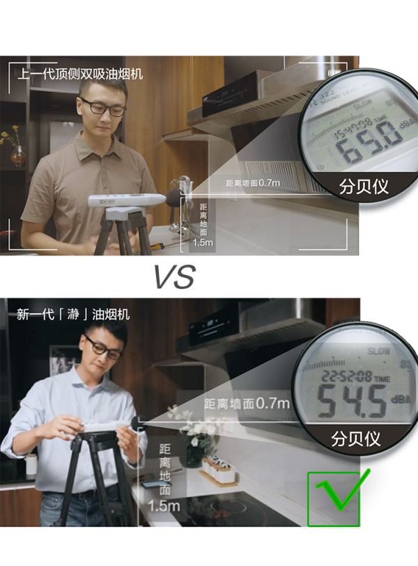 在家居環(huán)境下真的能做到十分安靜嗎?中國家用電器研究院在環(huán)境噪音為35分貝左右的真實(shí)廚房環(huán)境下,分別對(duì)A.O.史密斯兩代頂側(cè)雙吸油煙機(jī)進(jìn)行了測(cè)試。