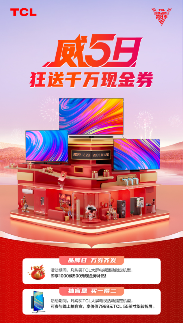 這次親身經歷,真的讓我感受了頂級電視的魅力,準備給老家也換個新電視,發現從2022年12月13日到2023年1月20日還是TCL 的“威5日”大促活動,購指定機型就可參與線上抽盲盒,中獎率100%,說不定還有機會抱走一臺價值7999元的TCL旋轉智屏回家了。另外還有品牌日萬券齊發、購TCL指定大屏享1000元現金券等優惠,力度不比雙十一差,立刻下單,就這么定了!