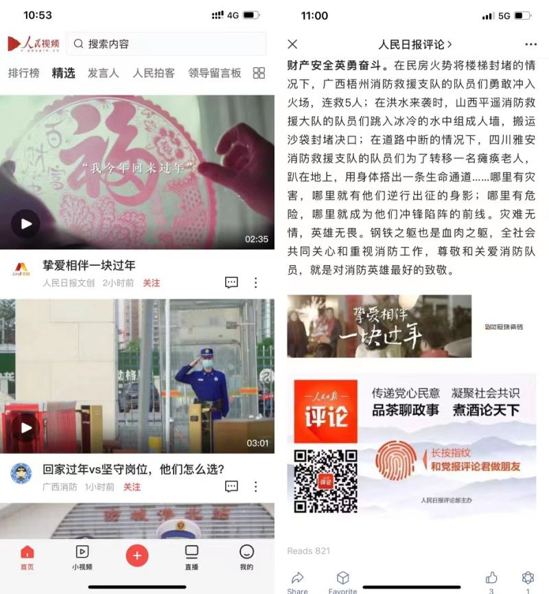 借著權威官媒的時代視角,我們洞察到每一份團圓的背后,是無數普通人所展現出的家國擔當。他們是為團圓護航的鐵路員工、是24h待命的消防員、堅守抗疫前線的醫護工作者、戍邊守疆的邊防戰士······