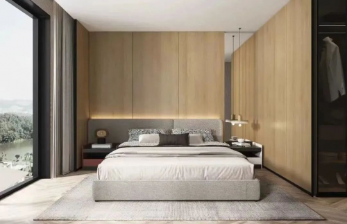 嘉陵南岸雨初收,江似秋嵐不煞流。整體色調如秋天原野般溫暖,自然暖黃結合天然木紋,紋理細膩不突兀。細看底紋婉約,山紋柔順,嫻雅柔美的曲線如同田野精靈的舞蹈軌跡,以質樸色彩為空間帶來柔和的安全感,用來自大自然的原木色慰藉風塵仆仆的心。