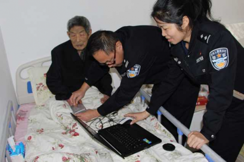 “蔣爺爺,你放松手指哈,馬上就好”戶籍民警在病床前安慰著這位近九旬老人。