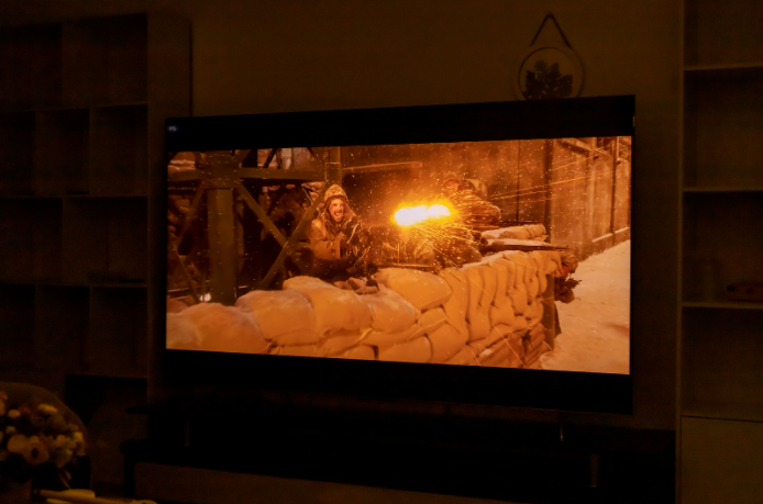 我爸愛看戰爭片,那天晚上就找了個大片大家一起看,到戰斗激烈的時候,這電視的優點就更明顯了,迅速移動的鏡頭加上高速切換的場景,絲毫沒有拖沓的感覺,機關槍的火力,到戰士們臉上的表情細節,都體現得相當細膩,加上這電視音響還特別好,真有種身處戰場的緊張感。也許是太真實了,我奶奶都從里屋出來吼我爸了,說看啥不好非看打仗的,好日子剛過幾天就不消停了,給我爸數落了一頓,后來就換看別的了,大家在一旁都幸災樂禍,好不歡樂。