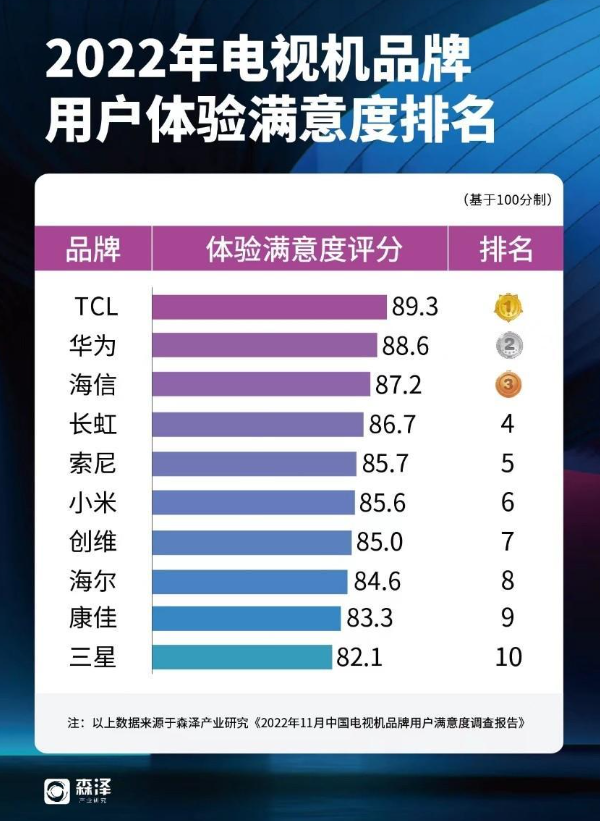 國內知名產業調研機構森澤《2022年中國電視品牌用戶滿意度調查報告》種顯示,14.8%的用戶對TCL好感度最高,在用戶好感度排名第一。在消費者整體滿意度評價中TCL得分為89.3分,排名第一。TCL品牌的復購率為81.0%、用戶凈推薦值達到為50.7%,同樣位列第一。用科技為產品賦能、用畫質滿足用戶,是TCL收獲市場銷量與用戶口碑的關鍵因素。
