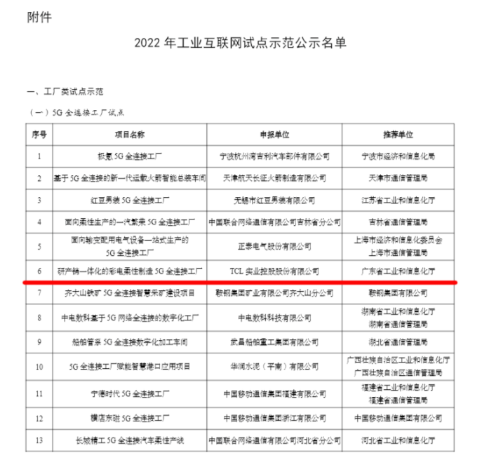 日前,中國工業部和信息化部公示了2022年工業互聯網試點示范名單,TCL實業以“研產銷一體化的彩電柔性制造5G全連接工廠”項目建設成功入選國家“5G全連接工廠”,全國全行業僅33家獲此殊榮,全國智能家電行業更是只此一家。
