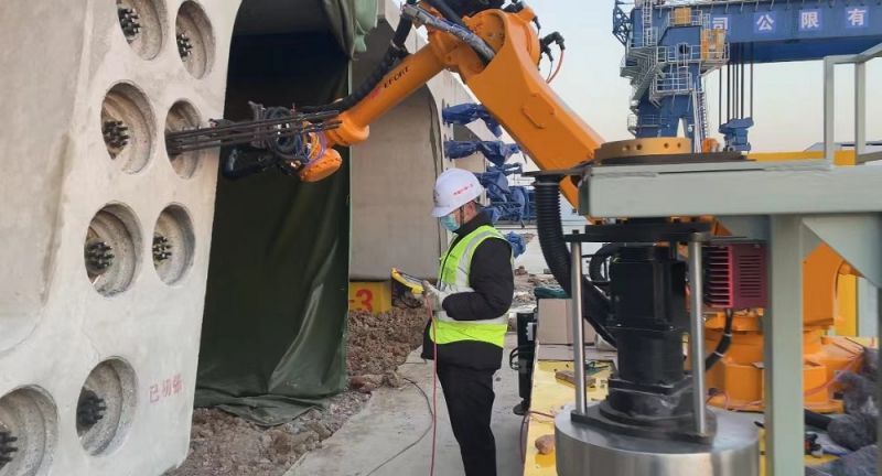 引進智能設備,提升梁場機械化和智能化水平。公司梁場建設了全自動鋼筋加工生產線,采用全自動內模支架,投入模板全自動打磨和噴涂設備、智能振搗整平機、智能養護設備、電動無線遙控張拉臺車、智能壓漿一體臺車、自動鑿毛與切割機器人等智能設備,梁場機械化水平達到80%以上,70%以上的施工設備實現了自動化、智能化。