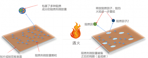 板材受熱時,刨片表面的微膠囊破裂,吸收熱量,同時釋放的高效阻燃因子能稀釋燃燒區域的可燃物濃度,有效抑制火焰蔓延。微膠囊破裂后,碳化、鹽化的產物覆蓋在刨片表面,阻止煙氣逸出,實現阻燃抑煙的雙重效果。